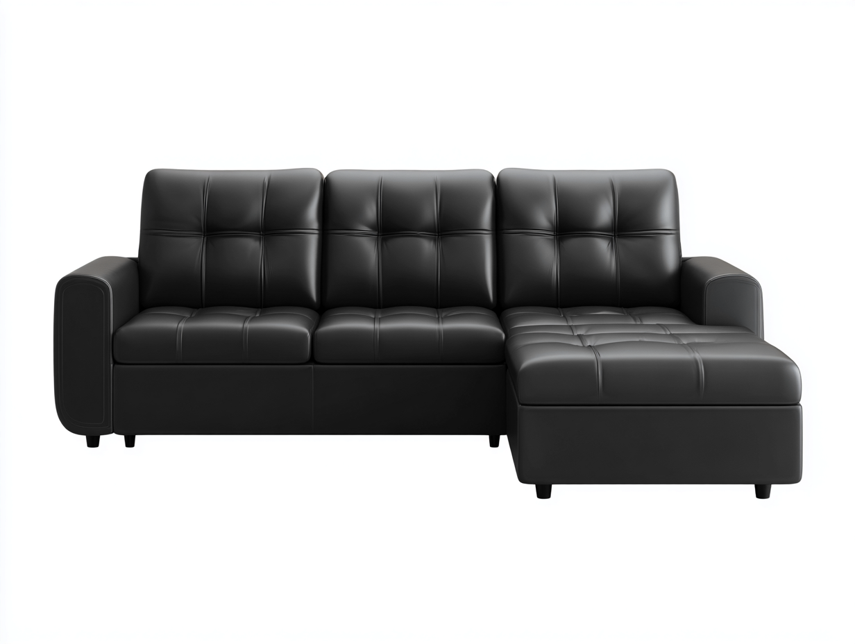 Rivestito in pelle sintetica di colore nero, il divano offre una superficie liscia, facile da pulire e resistente all'usura. La struttura interna è realizzata per garantire stabilità e durata nel tempo, mentre i piedini assicurano un appoggio solido e uniforme.